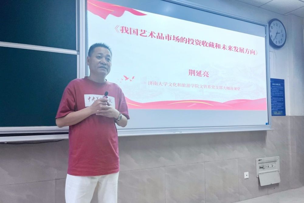 7月2日下午,主校区第一教学楼205教室座无虚席,文化和旅游学院党建学术工作坊第三期活动如期拉开帷幕。本期的“大咖进课堂”以《我国艺术品市场的投资收藏和未来发展方向》为主题,特邀我国艺术品市场大咖荆延亮先生为主讲嘉宾。文化经营管理系党支部教师及文化产业管理专业2022级学生齐聚一堂,共同参与了这场期待已久的学术盛宴。活动由学院党委书记孟德洋主持。