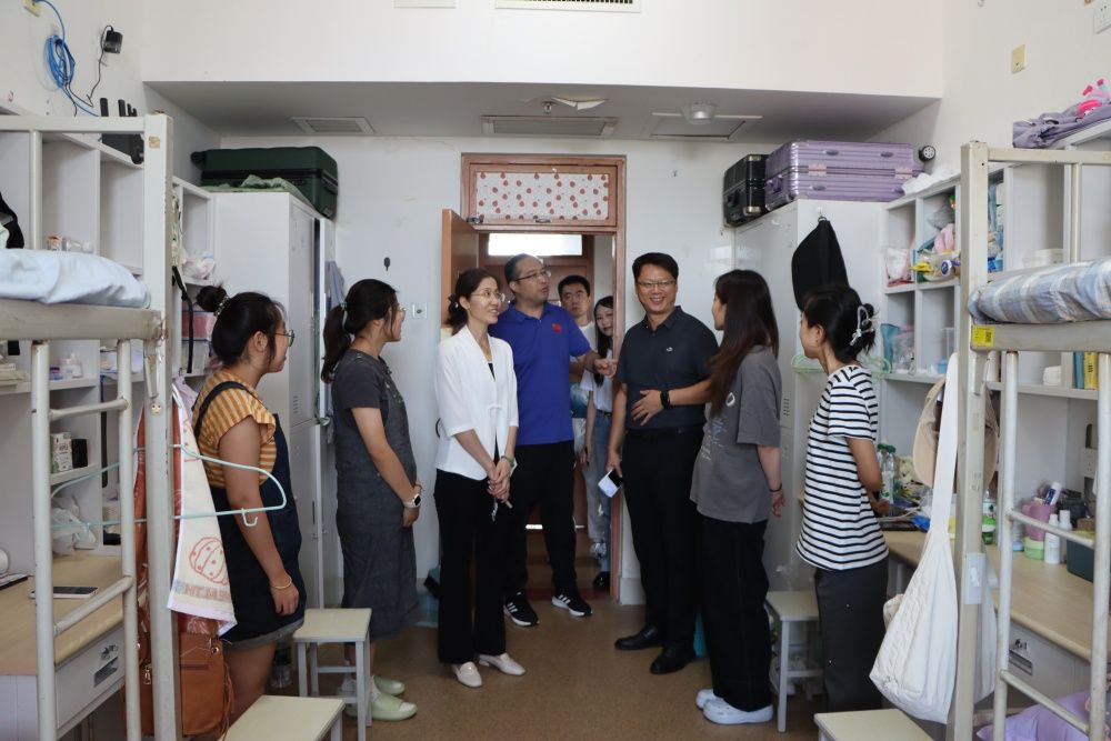 一行人逐一走访了本科生和研究生新生宿舍。郭英与新生们进行了亲切交谈,详细询问了同学们对宿舍和校园环境的适应情况,叮嘱同学们要在新环境中互相照顾、互相学习、互相督促,同时务必重视卫生及安全问题,并嘱咐同学们如有困难、有问题务必及时向辅导员们反映。