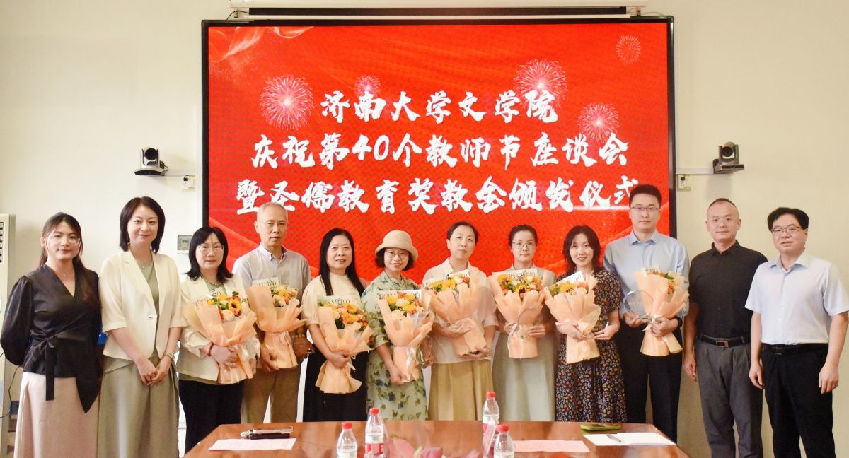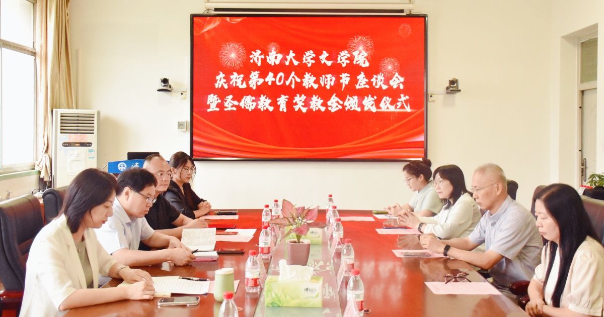 春风化雨润桃李,硕果累累颂师恩。9月10日,文学院举行庆祝第40个教师节座谈会暨圣儒教育奖教金颁发仪式。学院党委书记董海军,圣儒恒信(山东)教育科技有限公司总裁王建伟、副总裁孟瑶,获奖教师代表等参加了会议。会议由学院党委副书记、副院长潘颖主持。