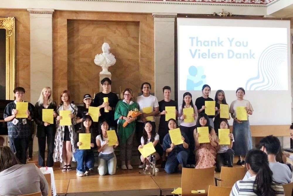 研学期间,同学们通过德国语言、语音、会话、写作、文学、艺术等课程的学习,不断提升专业技能,拓展国际视野。同时,同学们在课余时间游览独特古堡,品尝特色美食,欣赏经典歌剧……深刻体验异国文化风情、在中外不同文化差异中感受和合之美。经过一个月的学习,研学团成员获得了哥廷根大学颁发的语言证书。