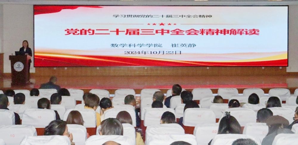 为深入学习贯彻党的二十届三中全会精神,深化理论研究阐释,引导广大师生员工深刻理解、全面把握全会精神,10月22日,数学科学学院党委书记崔英静进行学习贯彻党的二十届三中全会精神宣讲,学院全体教职工参加学习。