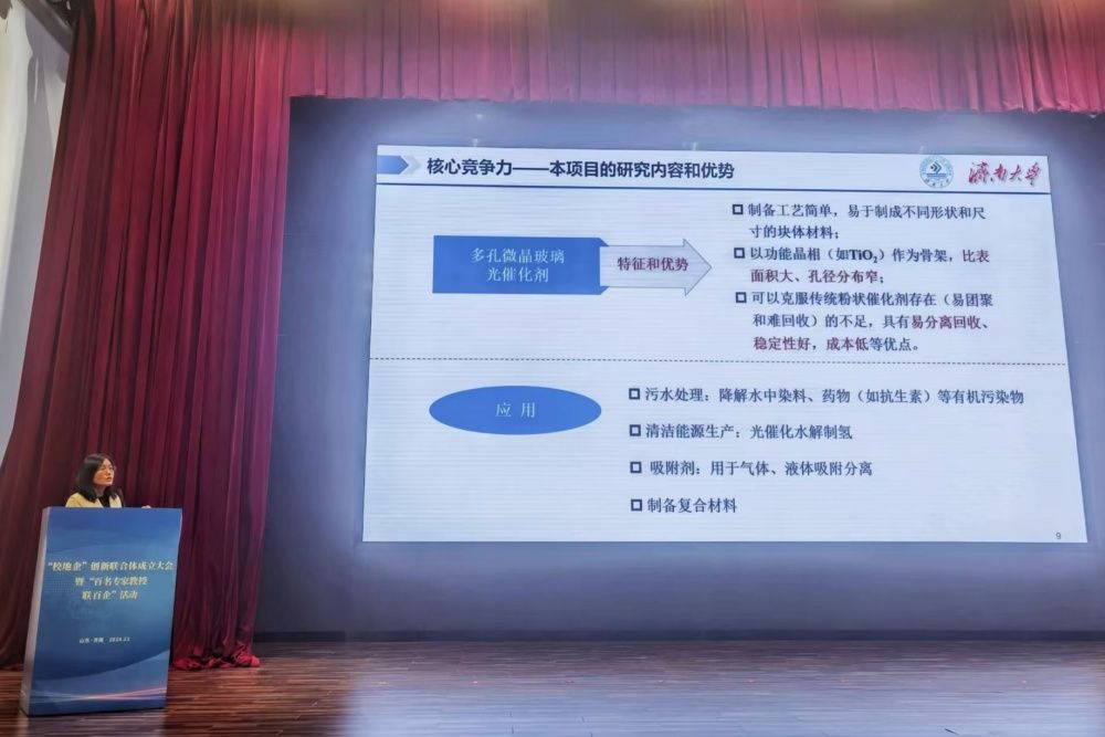 活动发布了“校地企”创新联合体(科研攻关)联合声明书,公布了“校地企”创新联合体(科研攻关)创始成员名单。活动现场,材料科学与工程学院张维娟结合自己的科研成果《用于降解废水中有机污染物的多孔微晶玻璃块体光催化剂》进行了推介路演。