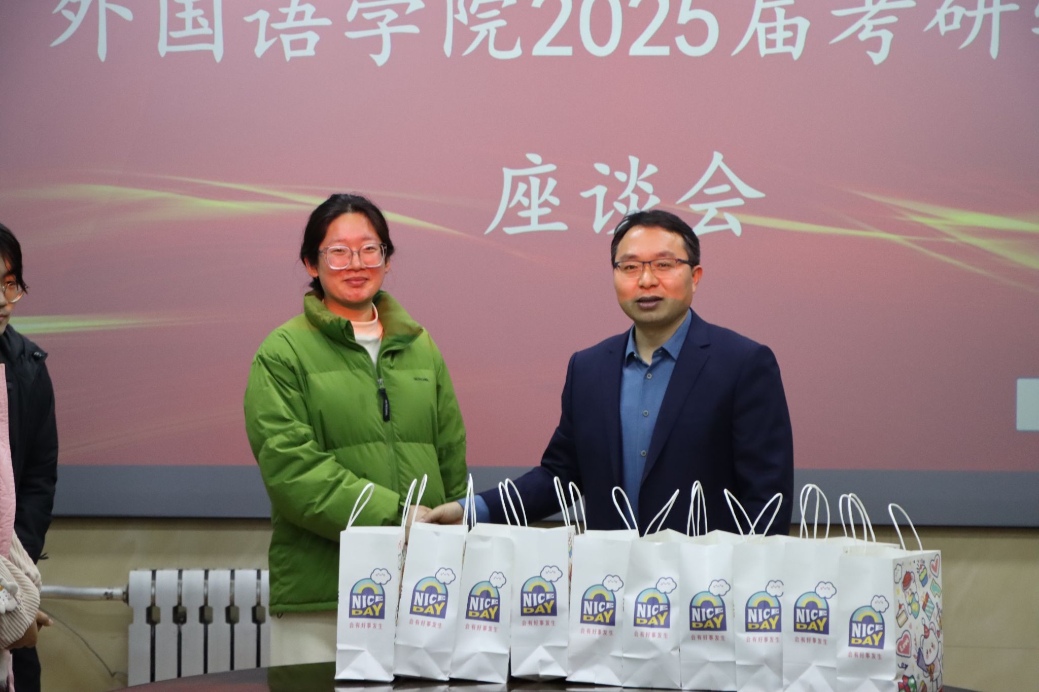 为缓解考研学子考研压力,增加备考信心,助力学子们以更饱满的精神状态迎接挑战,12月8日,外国语学院开展了考研学子慰问活动,为即将踏上考研征途的学子送上最真挚的关怀与祝福。学院院长宋庆伟、党委副书记、副院长郭英,副院长王勇、毕业生辅导员和2025届考研学生代表参加了此次活动。