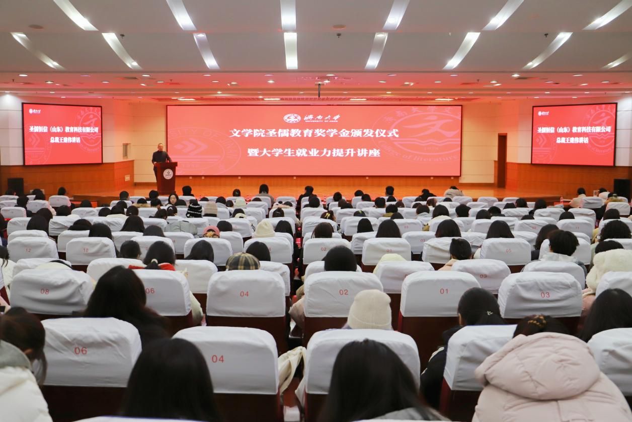 岁末寒天同聚首,以奖促学励鸿鹄。12月19日,文学院圣儒教育奖学金颁发仪式暨大学生就业力提升讲座在永利yl23411官网第二学术报告厅举行。圣儒恒信(山东)教育科技有限公司总裁王建伟,副总裁张文豪、孟瑶,学院党委书记董海军,院长范丽敏,党委副书记、副院长潘颖,文学院辅导员、班主任、学生代表等四百余人参加本次颁发仪式。仪式由文学院学办主任兼团委书记敖游主持。