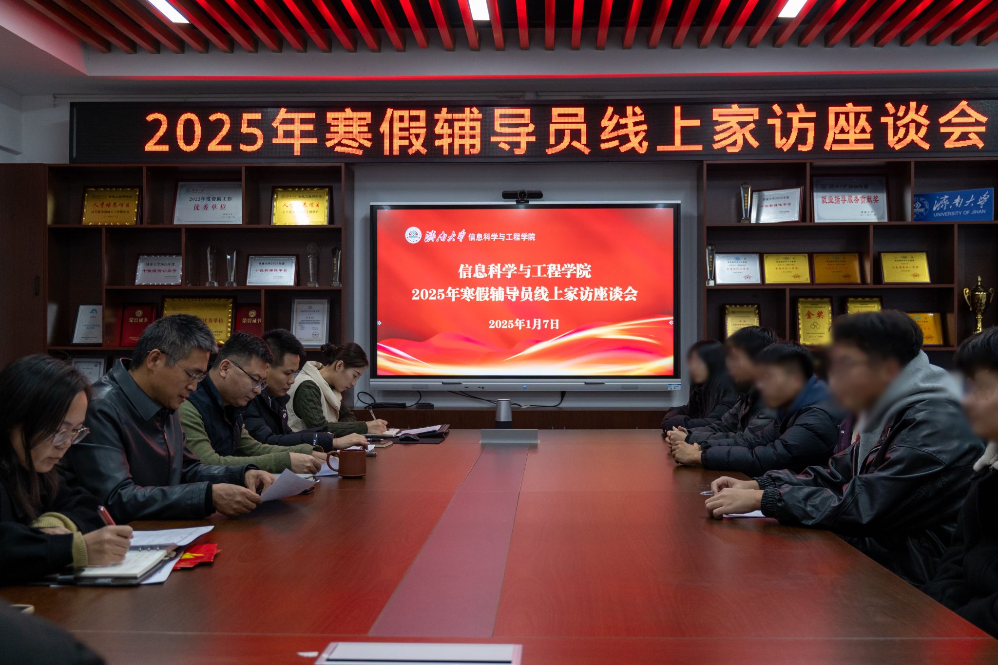 为围绕立德树人根本任务,进一步落实精准资助政策,扎实做好寒假家访工作,充分发挥各方优势、密切配合、相互支持,形成家校合力,共同关心学生生活、关注学生成长,1月7日下午,信息科学与工程学院在12教704召开了2025年寒假家访座谈会,通过腾讯会议、视频电话等方式与多名省外重点资助学生及家长进行线上交流,为受助学生家庭送去温暖和祝福。学院党政领导班子成员、全体学工人员、班主任代表以及部分学生及家长代表参与此次会议,会议由学院党委副书记、副院长郝伟主持。