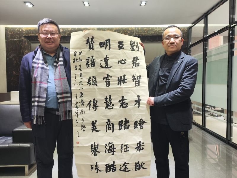 徐庆国向刘亚明赠送了永利美术与设计学院青年教师王书峰博士的书法作品。