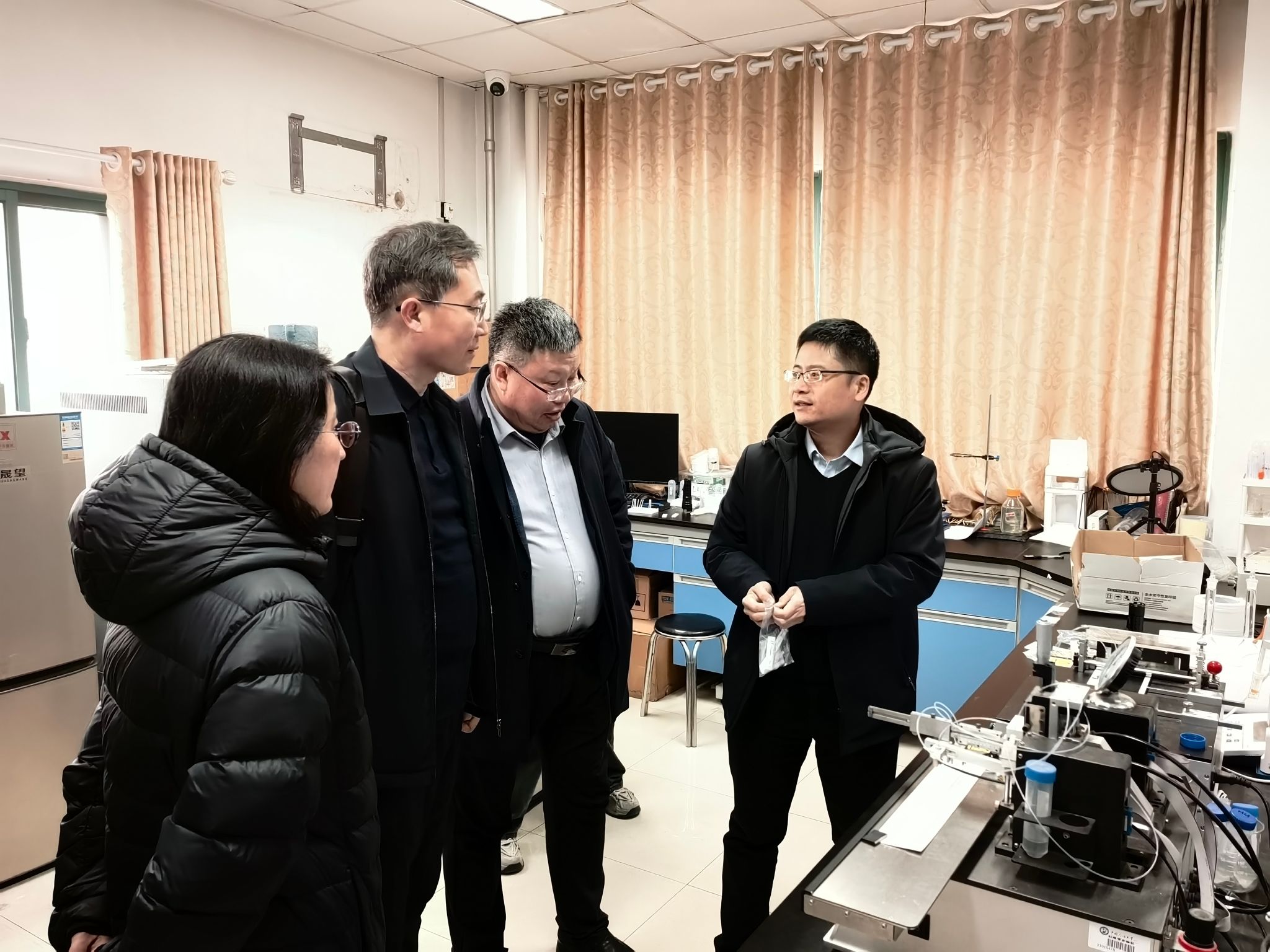 3月12日上午,徐庆国一行前往中国石油大学(华东)调研学习。中国石油大学(华东)党委统战部部长吕宏凌,化学化工学院党委书记张永宁等相关领导和专家一同参加调研。吕宏凌对徐庆国一行表示欢迎,并介绍了学校发展情况以及统一战线工作的开展情况,着重分享了在党外代表人士队伍建设、民族团结进步创建、欧美同学会分会建设等方面的经验做法与特色工作,希望两校今后能进一步增进交流,携手发展。会前,调研团一行参观了中国石油大学(华东)校史馆和化学化工学院及部分实验室。永利材料科学与工程学院校友、中国石油大学(华东)化学化工学院党委副书记徐光辉向徐庆国一行介绍了学院的发展情况,学院曾景斌教授详细演示了团队自主研发的多场景快速检测试纸条及配套智能读卡设备,电化学制氢装备实验室董斌教授向来宾介绍了团队自主设计搭建的各种自动化控制膜电极电解槽装备。