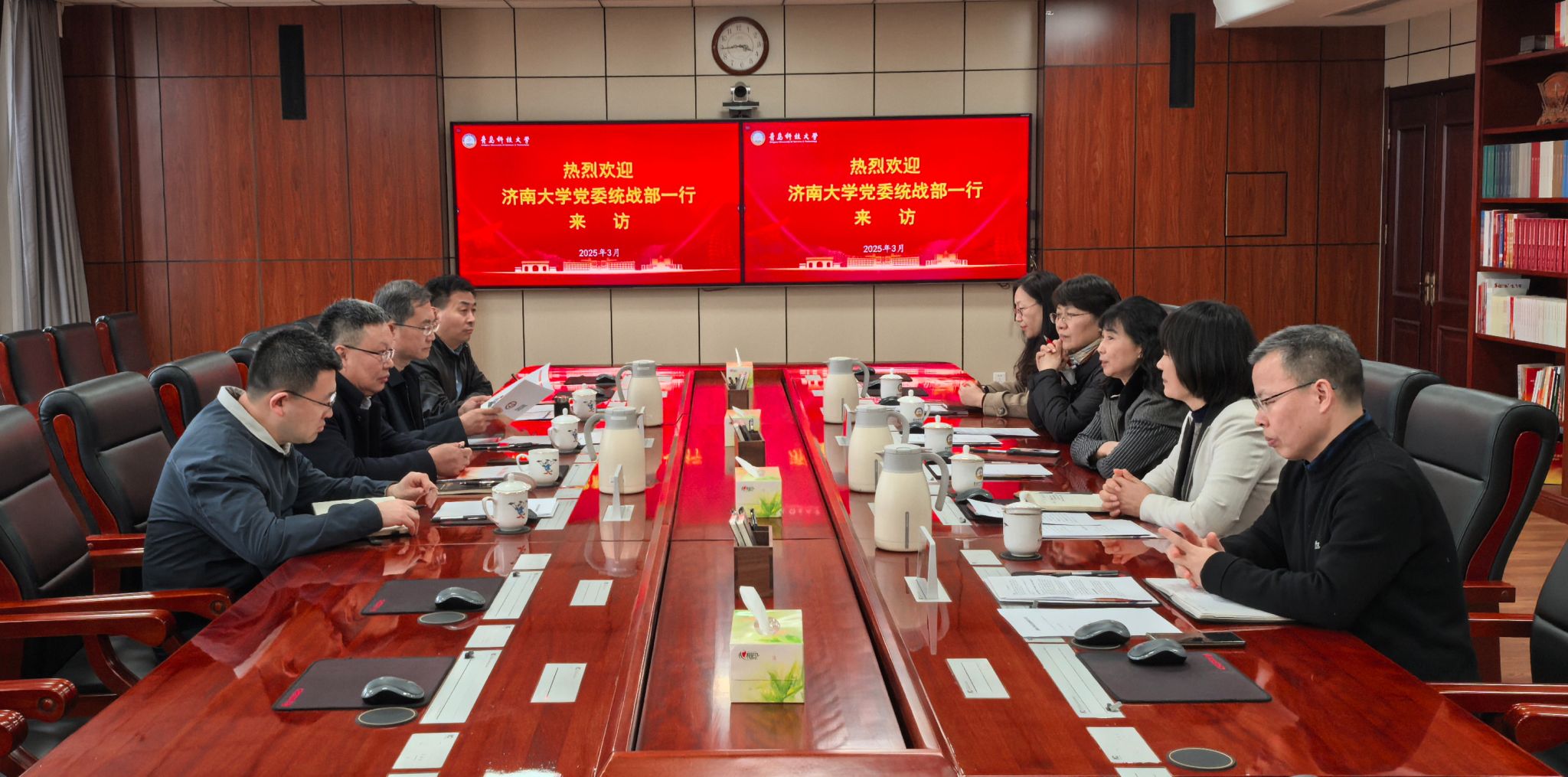 3月11日下午,徐庆国一行来到青岛科技大学调研学习。青岛科技大学党委副书记沈文青,党委常委、统战部部长秦姣出席座谈会。沈文青对徐庆国一行的到来表示欢迎,并全面介绍了学校的历史沿革、办学特色、学科优势以及政产学研融合发展等基本情况。她期望以此次交流为契机,加强两校间的全方位交流与合作,共同推动统战工作迈向高质量发展。座谈会上,秦姣介绍了学校在各党派团体自身建设、统战月度例会制度、台港澳侨工作、统战理论研究、政产学研融合等方面的经验做法。外国语学院党委书记曲斌艳汇报了学院统战工作开展情况,致公党青岛科技大学支部主委贾小平就建言献策、参政议政和支部活动开展等方面进行了深入交流探讨。座谈会前,徐庆国一行参观了青岛科技大学校史馆,了解学校发展历程。