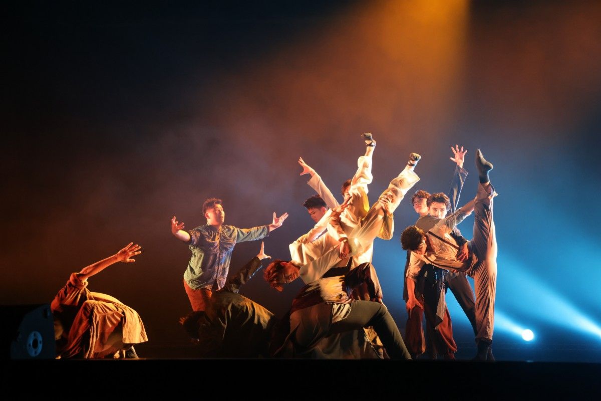 “剧目篇:还看今朝”将九个集艺术性、故事性、思想性、教育性于一体的完整舞蹈剧目作品依次呈现在舞台上。《晨曦中的玫瑰》以轻柔优雅的舞姿,生动展现玫瑰在清晨阳光下绽放的美丽、纯洁与高贵;《十月记》以十月革命为背景,再现革命义士浴血守护孙中山的英勇故事;《海拔6000米》以藏族文化为基调,十位舞者化身守护藏羚羊的勇士,深刻诠释人与自然的紧密关系;《海上民谣》以海峡情思为纽带,以闽南文化为底色,唤起两岸同胞的共同记忆;《新生》中男孔雀形象的舞者通过颤抖的肢体语言,诉说生命的轮回与坚韧;《月出佼人》将古典诗词转化为舞蹈语言,展现月光下的古典美学与诗意情怀;《寻影山间 古韵翩跹》《云烟水渡山谣引》两个组舞作品中,敦煌双人舞《佛窟掠影》以云冈石窟佛像造像为创作背景,展现北魏造像的神秘庄严;《回家的路并不遥远》融合藏族民间舞与现代舞元素,讲述文化认同与心灵归属的动人故事;《越女凌风》《且看行云》《雨后》《大青树下》《热巴顾》等也展现了同学们对舞蹈艺术的深度探索,是他们用舞姿书写的青春答卷。原创剧目《足迹》压轴登台,以极具力量感和信念感的舞台表现,诠释追梦者在困境中不屈前行的历程,融入《红高粱》等文学意象,展现齐鲁文化中的生命张力。