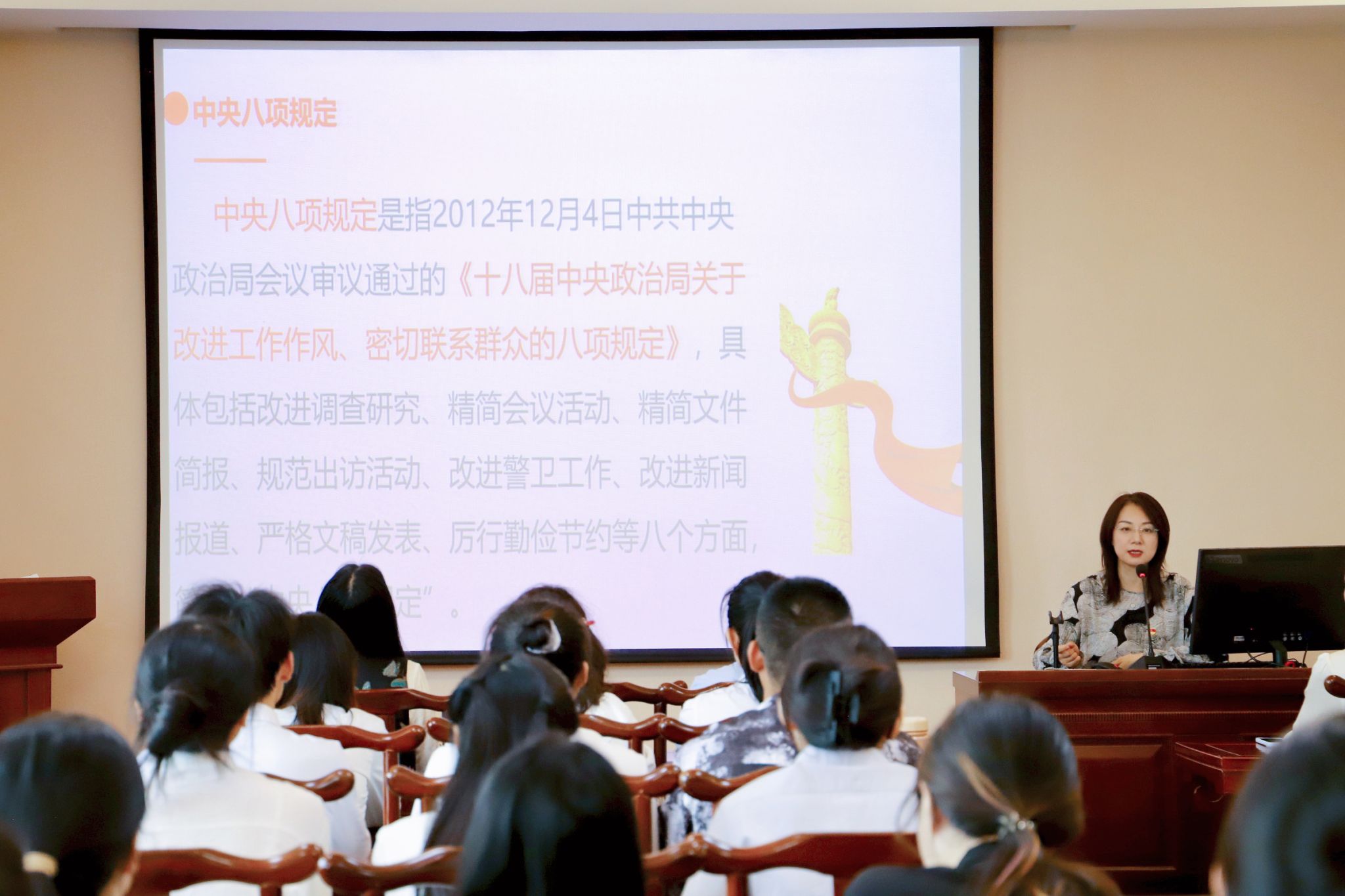 潘颖以《弘扬好作风 奋进新征程——让中央八项规定精神成为自觉遵循》为主题,为毕业生党员讲授专题党课。她阐释了中央八项规定精神的核心要义与实践要求,并针对毕业生党员即将继续从业从学的特点,讲述学生党员应如何落实中央八项规定精神,强调了毕业生步入社会之后廉洁从业的重要性。她寄语毕业生党员要始终牢记党员身份,坚定理想信念,扣好廉洁从业的“第一粒扣子”,将个人理想融入国家发展大局;要以信念铸魂、以规矩为尺、以担当力行,在新时代新征程中乘风破浪、行稳致远。