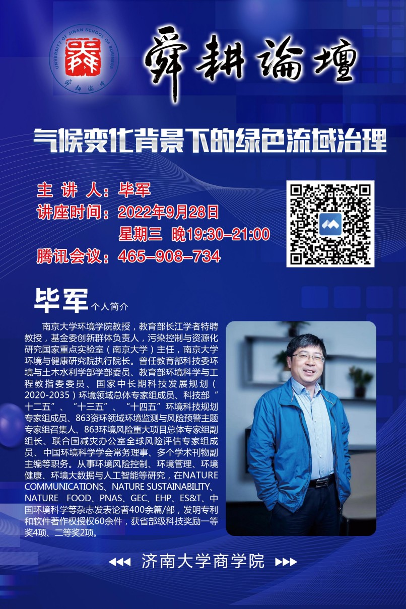 舜耕论坛本期邀请南京大学毕军教授讲座,主题是:气候变化背景下的绿色流域治理。