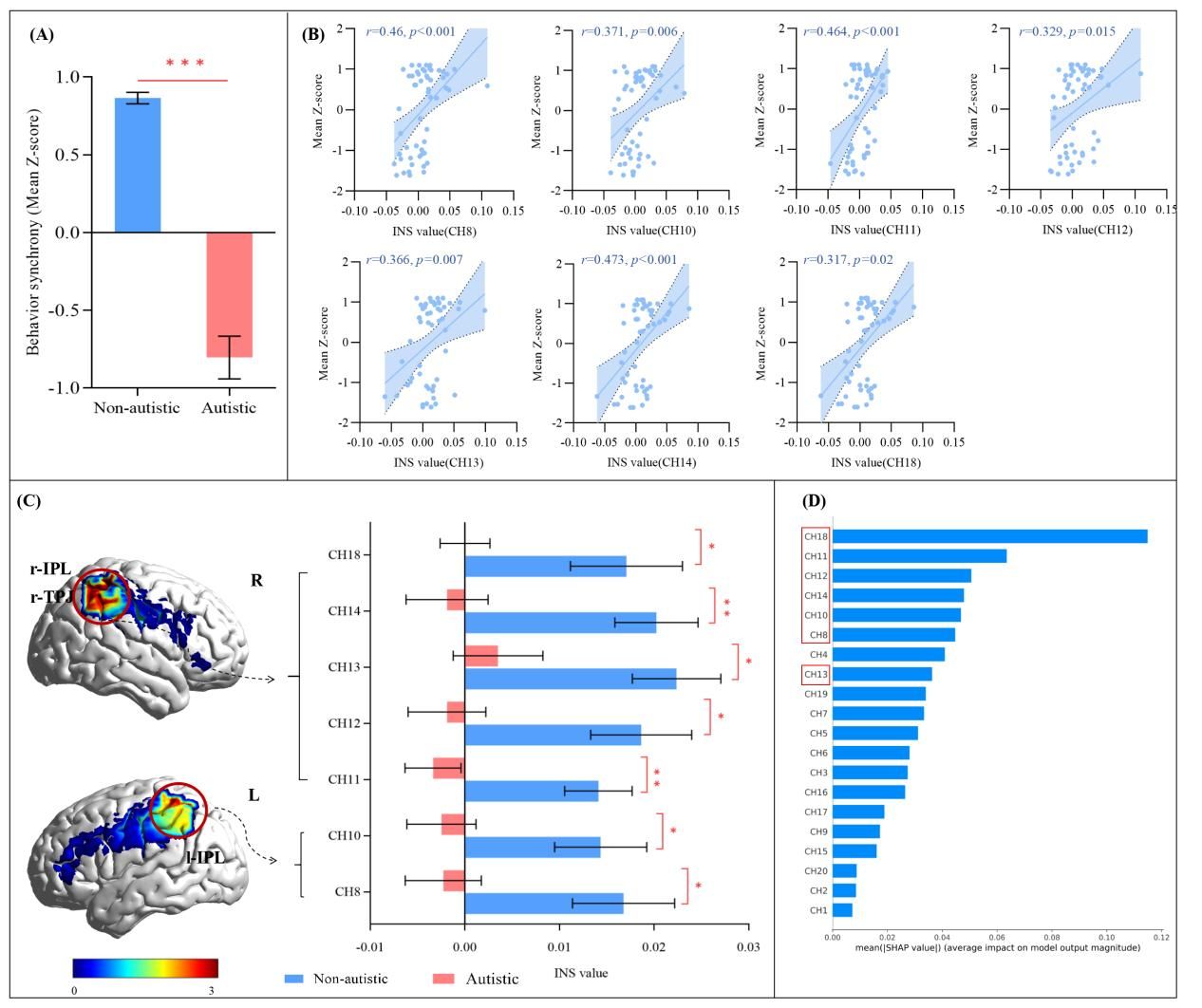 Social motor synchrony is a core foundation of children's social interaction and a key indicator of early development, yet research findings on this phenomenon in the autistic population have long been controversial. Previous studies are mostly confined to a single disciplinary perspective, focusing on behavioral synchronization or activation analysis of individual brain regions, while neglecting the interbrain neural synchronization mechanism that underlies the interaction between two parties in social contexts. Breaking through the barriers of a single discipline, the team innovatively combined cutting-edge neuroscientific technology—functional near-infrared spectroscopy (fNIRS) hyperscanning—with artificial intelligence machine learning methods. From the novel perspective of interbrain neural synchronization, they accurately distinguished the characteristics of intentional and spontaneous social motor synchrony in autistic children, confirming that interbrain neural synchronization indicators can serve as effective neural markers for distinguishing the autistic population. Additionally, this study represents the first application of machine learning methods to the classification of interbrain neural synchronization indicators both domestically and internationally, providing an innovative interdisciplinary approach for researching the interbrain neural mechanisms of neurodevelopmental disorders such as autism. The research results offer new neural markers for the early screening and accurate diagnosis of autism, and lay a solid foundation for the formulation of subsequent targeted intervention programs, demonstrating the value of the integration of "psychology + neuroscience + information science."